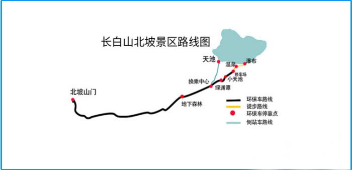 Tips:长白山各个景点之间距离都很远,需要乘坐做环保车往返,上图中红色点为车站停靠点,我们可以随时在这上车下车等车。正常情况下每个坡都需要一天的时间才能游览全面,所以这就需要我们提前计划好游览景点的先后循序可以由远及近也可以由近及远,也可以根据当天天气情况而定,如果天气晴朗那么直奔天池,如果多云或小雨可以先游览其他景点在游览天池。